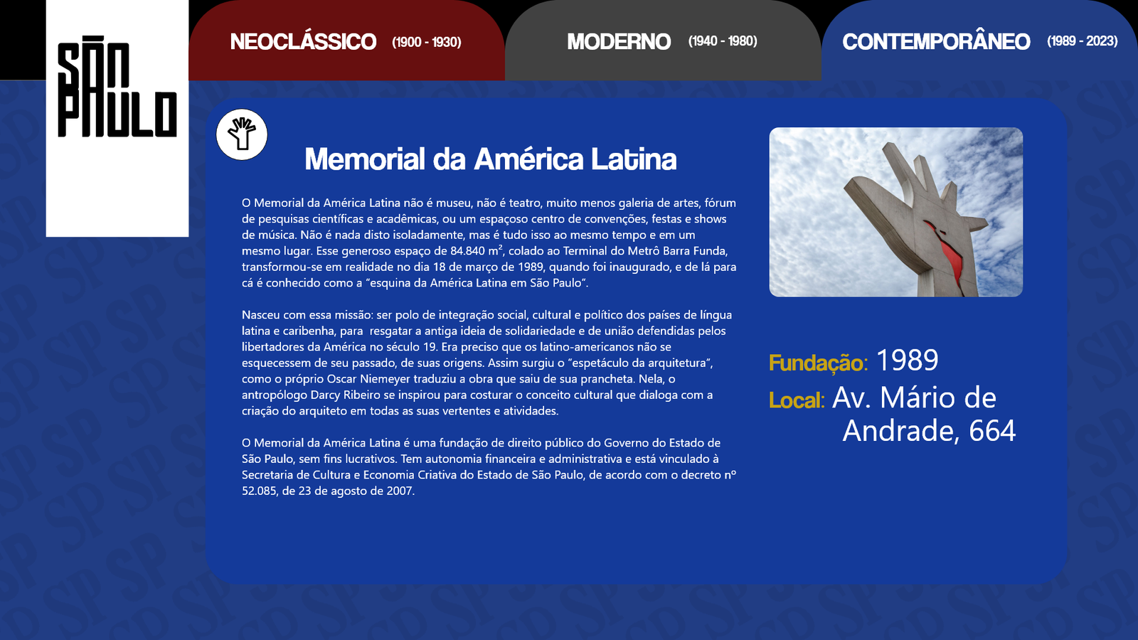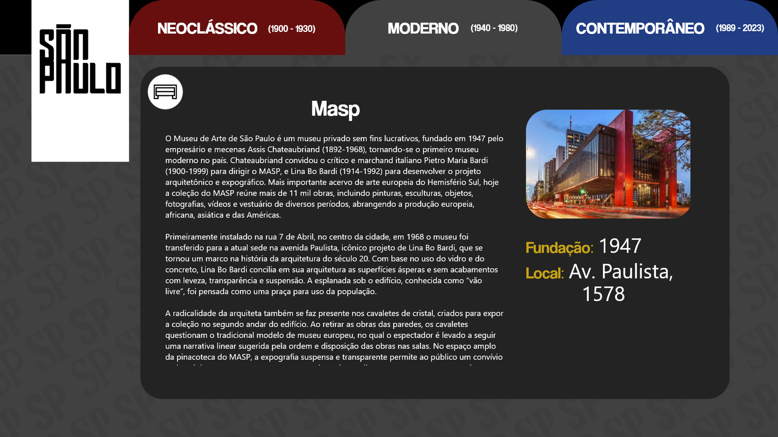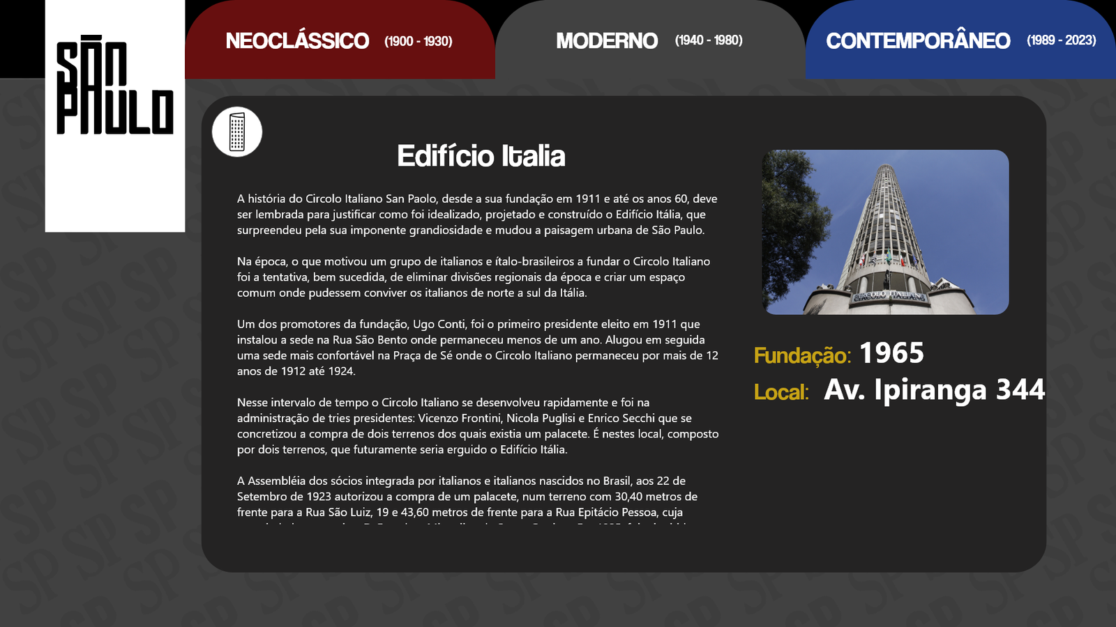 Conhecida como a grande selva de concreto, a cidade de São Paulo é uma paisagem com de tudo um pouco. Há diversidade nas pessoas, músicas, culturas, arte e principalmente arquitetura e história. Diante disso nosso design digital foi desolvido com base na arquitetura paulistana e suas mudanças ao longo do anos.