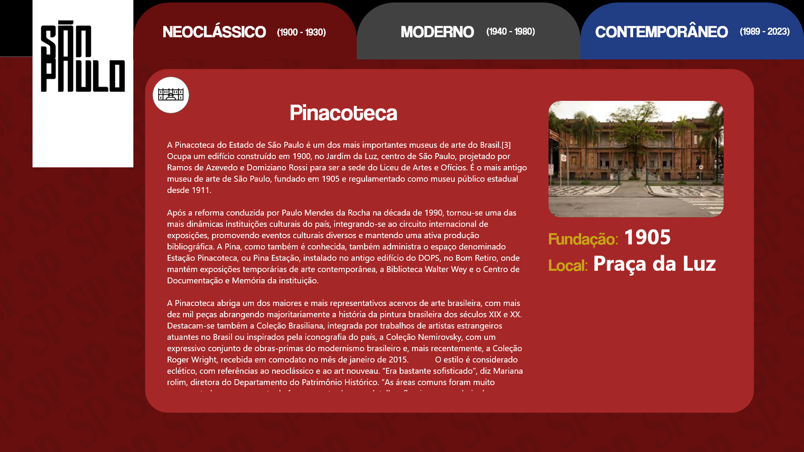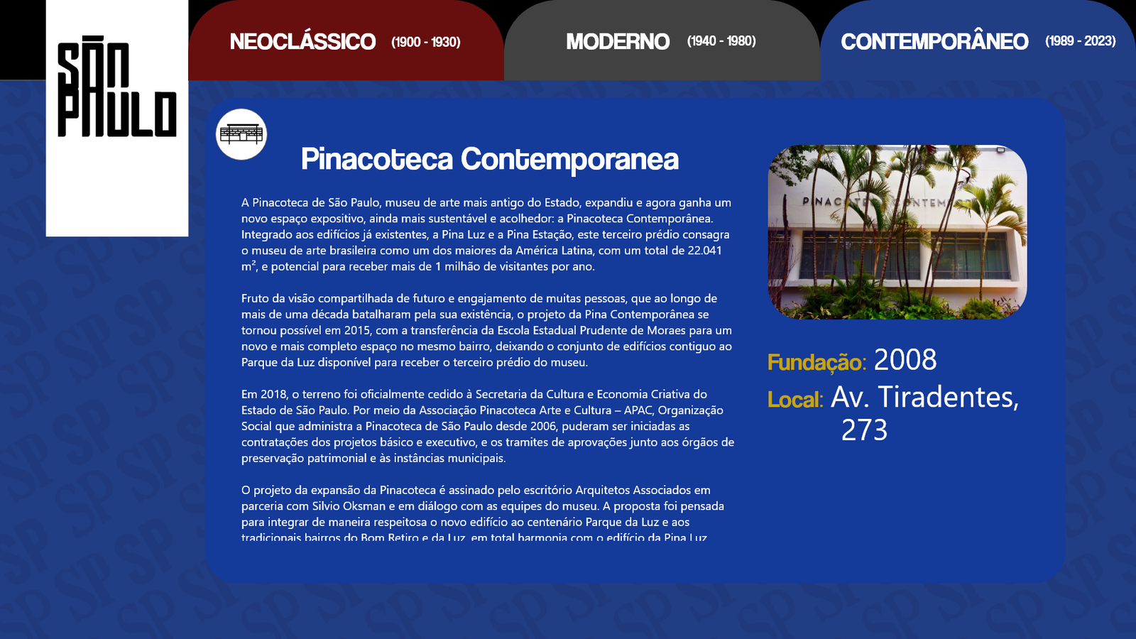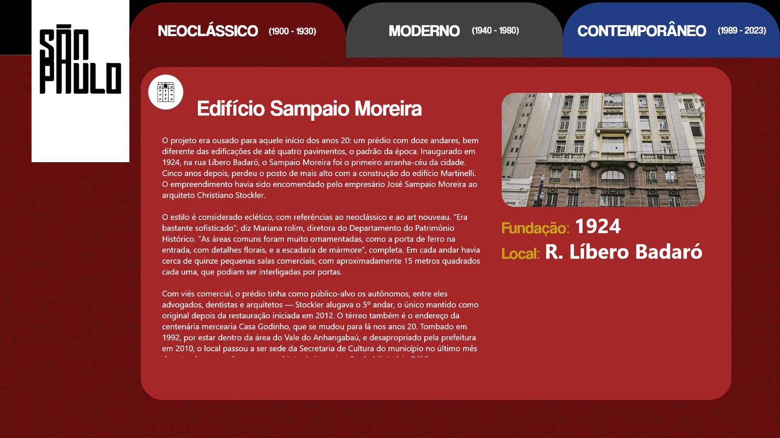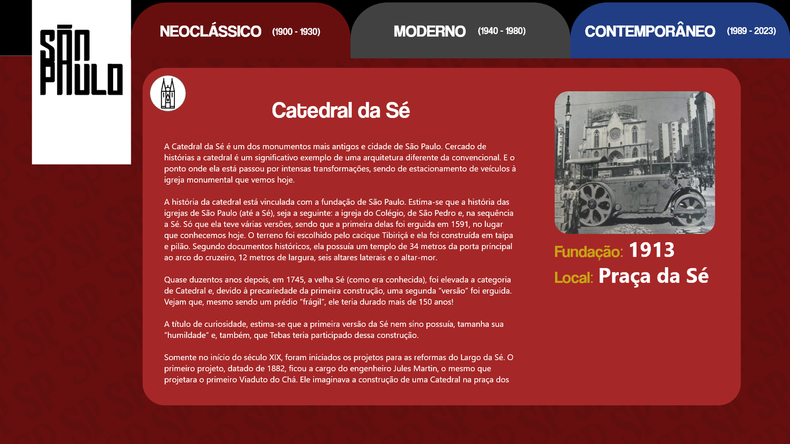 Conhecida como a grande selva de concreto, a cidade de São Paulo é uma paisagem com de tudo um pouco. Há diversidade nas pessoas, músicas, culturas, arte e principalmente arquitetura e história. Diante disso nosso design digital foi desolvido com base na arquitetura paulistana e suas mudanças ao longo do anos.
